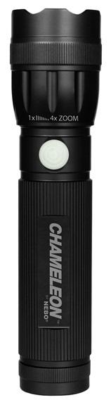 No color filtersno separate headsand no extra attachments. The Chameleon by NEBO offers 3 vibrant colors all in one convenient, compact flashlight. One color changing LED switches from white to green to red with the touch of the glow-in-the-dark On/Off button. The Chameleon features a 4x adjustable zoom to change the beam from spot light to flood light with the simple twist of the head. The white setting produces 140 lumens of bright white light and is best used for all around purposes. The Chameleons ergonomic textured handle keeps this light secure in the palm of your hand; or when you need your hands to be free just use the powerful magnetic base to create hands-free lighting.