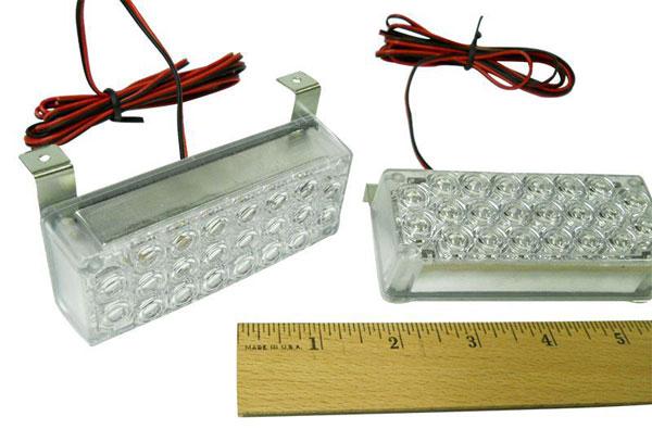 CRAZEDpilot's super-bright 12 volt LED light with 22 embedded high output LED's for landing or strobe light systems with a power draw less than 200mA from each lamp at 12 volts to produce nearly 250 lumens. Each lamp measures 4″L x 1″W x 1.75″H These BRIGHT WHITE lights only weight 2 oz each! This provide a lot of light in a very small, low current package!