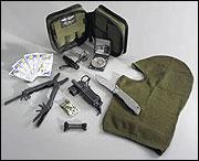 Designed by Oregon Aero for the U.S. Navy. The durable carrier pouch is hand sewn by Oregon Aero with pockets for each item. Knife, fire starter and flashlight lanyards attached to carrier. Special zipper permits access to folding knife without opening the carrier. 6.5" high, 5.5" wide, 2" thick.