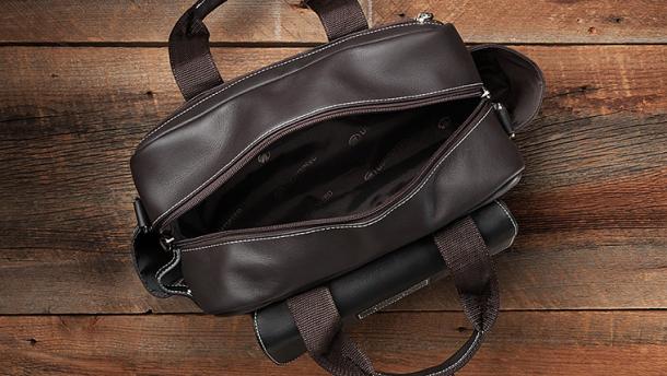 - A center top zipper opens into a large, lined main compartment roomy enough for headsets and other essentials