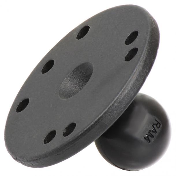 The (RAM-B-202U) RAM marine grade aluminum base contains a 1" diameter rubber ball connected to a flat 2.5" diameter base. This mount has pre-drilled holes, including the universal AMPS hole pattern.